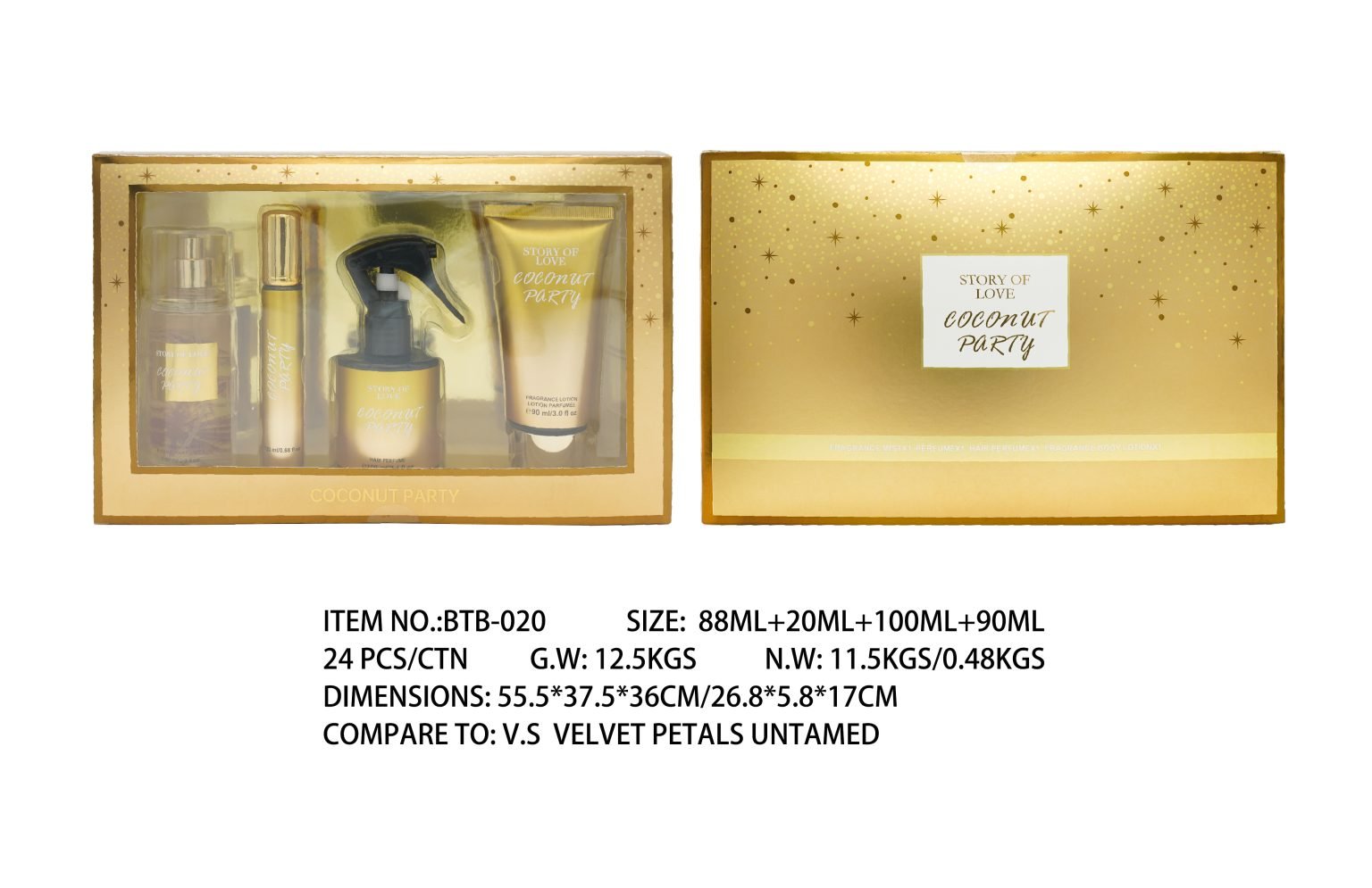 Box set contains hair perfume 100ml, fragrance lotion 90ml, eau de parfum 20ml, fragrance mist 88ml